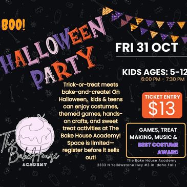 Calling all ghosts, ghouls, and little goblins! Join us on Halloween, October 31st, for a frightfully fun evening at The Bake House Academy! Designed primarily for ages 5–12, all ages are welcome! This party will be packed with costume contests, Halloween games, spooky crafts, mus